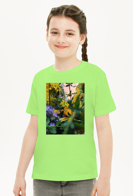 Koszulka dziewczęca z motywem kolorowych kwiatów na przodzie koszulki.