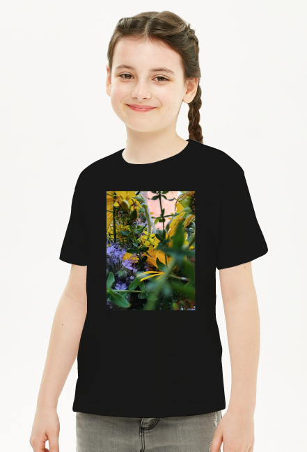 Koszulka dziewczęca z motywem kolorowych kwiatów na przodzie koszulki.