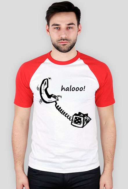 Koszulka męska w sportowym, amerykańskim stylu z unikalną grafiką starego telefonu i napisem "halo"! Wykonana w całości z bawełny, posiada kontrastowe rękawy w kolorze czarnym lub czerwonym. Koszulka stary telefon to śmieszny t-shirt dla każdego mężczyzny z poczuciem humoru, idealna na prezent dla taty, brata, kolegi, chłopaka, męża.