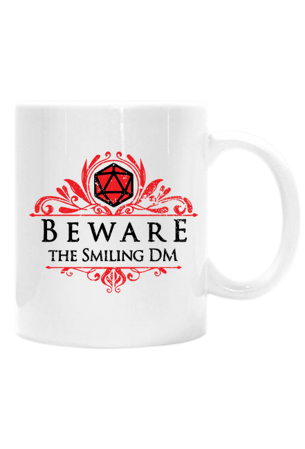 Ten uśmiech nie wróży nic dobrego. Jeśli Twój Mistrz Gry uśmiecha się bez powodu, to wiedz, że właśnie wymyślił coś, co zaboli. Kubek „Beware the Smiling DM” to idealny gadżet dla każdego fana RPG – i ostrzeżenie dla drużyny!