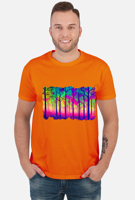 Koszulka z zaczarowanym kolorowym lasem to prawdziwa uczta dla oczu i wyobraźni. Na pierwszy rzut oka przyciąga wzrok niezwykłym wzorem, który przedstawia malowniczy las pełen barw i magii.