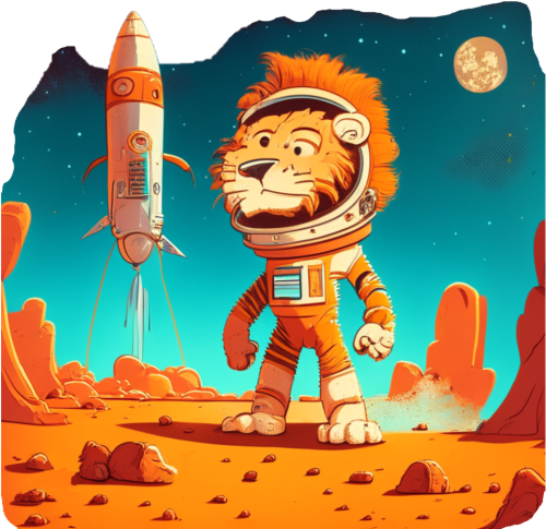 Koszulka przedstawia niezwykłą scenę - lwa w skafandrze kosmicznym, który ląduje na powierzchni Marsa obok ogromnej rakiety.