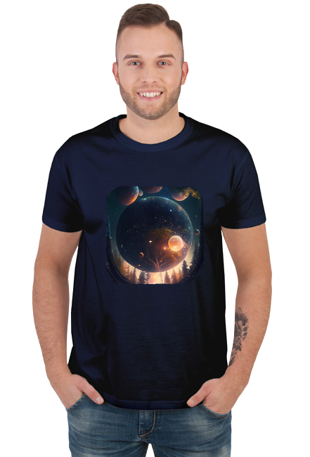 Koszulka przedstawiająca układ słoneczny w ciemnym lesie to prawdziwie niezwykły i tajemniczy widok. Na pierwszy rzut oka, możemy dostrzec gęste, ciemne drzewa, które otaczają całą przestrzeń. Ich gałęzie rozciągają się ku niebu, tworząc misterną siatkę, która dodaje całości odrobiny tajemniczości. Widok ten zapewnia silne poczucie natury i jej dominującej obecności w tym miejscu.