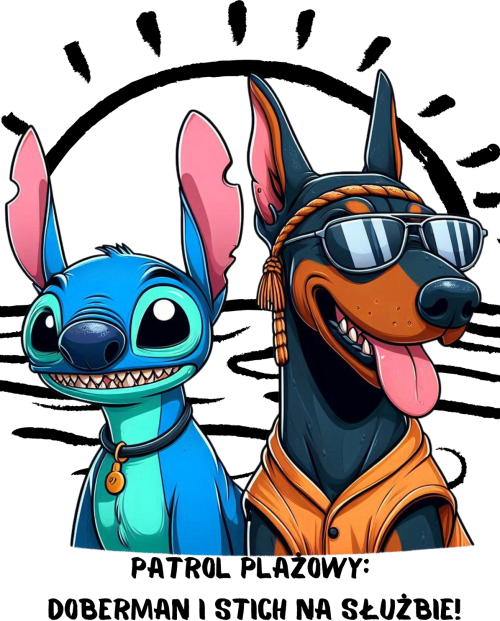 Patrol plażowy: Doberman i Stich na służbie! SKU: koszulka-damska-K02_6dlcbdou_4810775