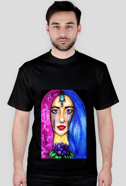 Model ma na sobie koszulkę w rozmiarze M. Maksymalne wymiary nadruku to 30cm (szerokość)
