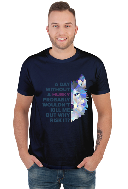 Koszulka dla miłośników husky i ich niezłomnego charakteru! Napis "A day without a Husky probably wouldn't kill me but why risk it", to humorystyczne wyznanie o niezwykłej więzi między Tobą a Twoim czworonożnym towarzyszem. Wygodny krój i miękka bawełna sprawiają, że ta koszulka idealnie sprawdzi się na co dzień i podkreśli Twoją miłość do tej wyjątkowej rasy.