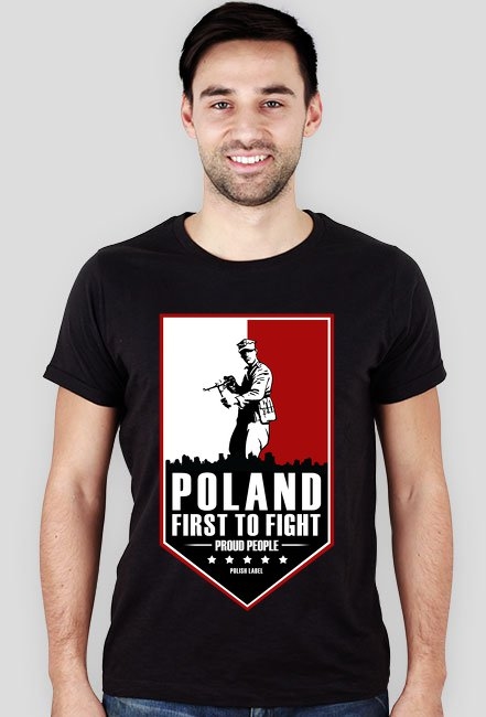 Koszulka czarna slim wchodząca w skład kolekcji Poland first to fight. Hasło to było wielokrotnie używane na plakatach w okresie II WŚ. Projekt zawiera sylwetkę polskiego żołnierze, który zawsze jest gotów do obrony swojej ojczyzny. W tle polskie barwy narodowe. Polecamy tą koszulkę wszystkim Polakom, którzy mieszkają zagranicą.