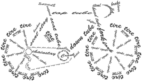 Szara grafika roweru - wykonana bezpośrednio z nazw części rowerowych w języku angielskim.