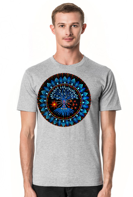Koszulka z nadrukiem malowanej przeze mnie mandali przedstawiającej Drzewo Harmonizacji.