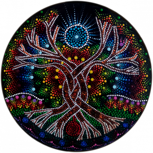 Koszulka z mandalą, która malowana była z intencją niesienia Inspiracji. Ma ona również harmonizować i odnawiać przepływ od korzeni po czubki konarów. Mówi o jedności przodków, tych co są tu i teraz i tych, którzy nadejdą. Mówi o tym, że przeszłość, przyszłość i teraźniejszość splatają się w tańcu świateł. Może zainspiruje cię do odkrywania swoich korzeni, albo do budowania Nowego, w oparciu o solidne podstawy.