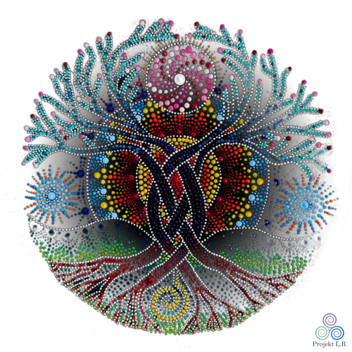 Koszulka z mandalą, która malowana była z intencją niesienia Inspiracji. Ma ona również harmonizować i odnawiać przepływ od korzeni po czubki konarów. Mówi o jedności przodków, tych co są tu i teraz i tych, którzy nadejdą. Mówi o tym, że przeszłość, przyszłość i teraźniejszość splatają się w tańcu świateł. Może zainspiruje cię do odkrywania swoich korzeni, albo do budowania Nowego, w oparciu o solidne podstawy.