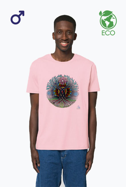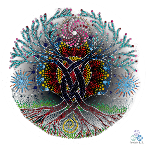 Koszulka z mandalą, która malowana była z intencją niesienia Inspiracji. Ma ona również harmonizować i odnawiać przepływ od korzeni po czubki konarów. Mówi o jedności przodków, tych co są tu i teraz i tych, którzy nadejdą. Mówi o tym, że przeszłość, przyszłość i teraźniejszość splatają się w tańcu świateł. Może zainspiruje cię do odkrywania swoich korzeni, albo do budowania Nowego, w oparciu o solidne podstawy.