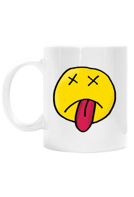 Biały kubek z nadrukiem - grafiką przedstawiającą skrzywioną buźkę z językiem. Kubeczek z motywem dla młodzieży i każdego z humorem.