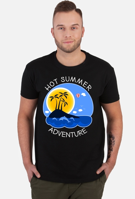 Czarna męska koszulka z nadrukiem - "Hot Summer Adventure". Tshirt w sam raz na lato i wakacje. A zimą będzie rozgrzewał przypominając fantastyczne wakacyjne chwile.