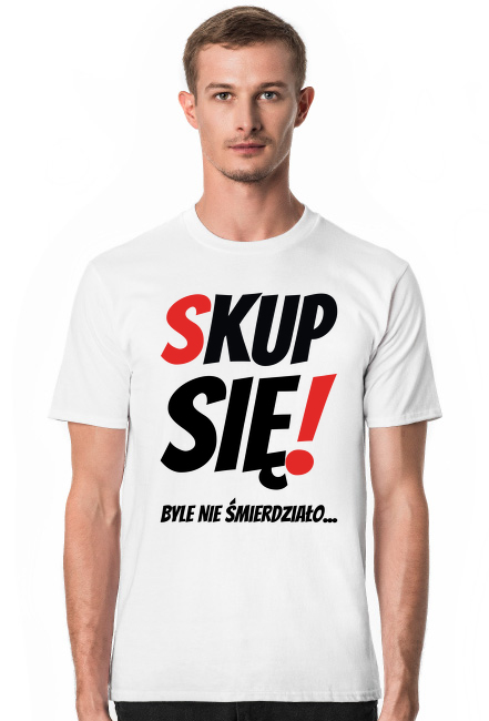 Tshirt męski z humorystycznym przesłaniem - "Skup Się! Byle Nie Śmierdziało...". Dla facetów z poczuciem humoru i dystansem do siebie i otaczającej rzeczywistości.