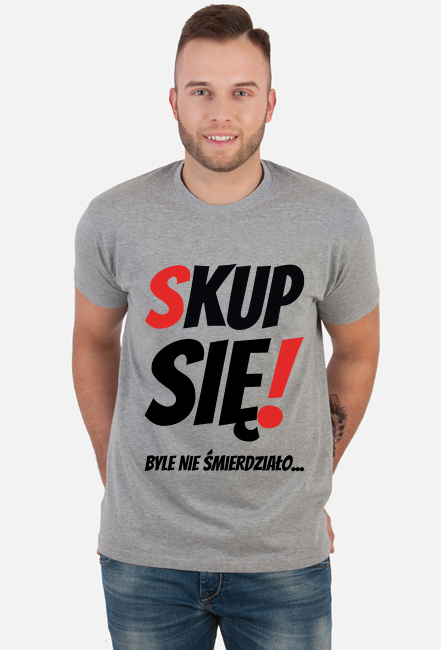 Tshirt męski z humorystycznym przesłaniem - "Skup Się! Byle Nie Śmierdziało...". Dla facetów z poczuciem humoru i dystansem do siebie i otaczającej rzeczywistości.