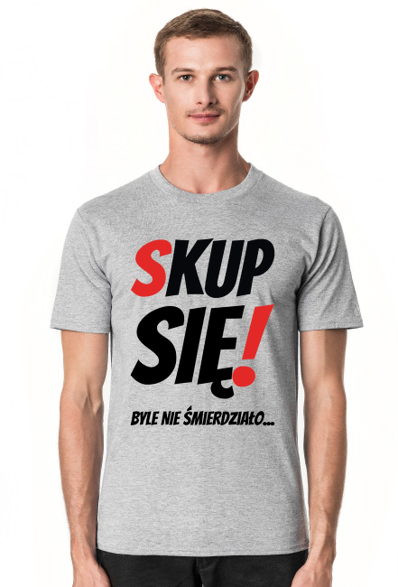 Tshirt męski z humorystycznym przesłaniem - "Skup Się! Byle Nie Śmierdziało...". Dla facetów z poczuciem humoru i dystansem do siebie i otaczającej rzeczywistości.