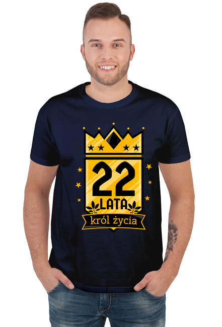 Męska koszulka na 22 urodziny z nadrukiem - Korona i napis "22 Lata Król Życia". Okazjonalny t-shirt na prezent. Koszulka z krótkim rękawem dla chłopaka, dla mężczyzny na 22-gie urodziny. Urodzinowy prezent dla syna, dla chłopaka, dla wnuka, dla kolegi, dla przyjaciela, dla osoby garściami korzystającej z życia. Dwadzieścia dwa lata to wyjątkowy wiek. Dwudzieste drugie urodziny.