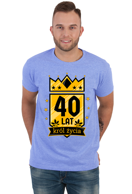 Męska koszulka na 40 urodziny z nadrukiem - Korona i napis "40 Lat Król Życia". Okazjonalny t-shirt na prezent. Koszulka z krótkim rękawem dla chłopaka, dla mężczyzny na 40-te urodziny. Urodzinowy prezent dla syna, dla chłopaka, dla wnuka, dla kolegi, dla faceta, dla przyjaciela, dla osoby garściami korzystającej z życia i lubiącej humor na czterdzieste urodziny. Czterdzieści lat to wyjątkowy wiek dla mężczyzn bo każdy wie, że życie zaczyna się po czterdziestce. Czterdziestolatek to człowiek korzystający z pełni życia więc czterdziestka do fantastyczny wiek.