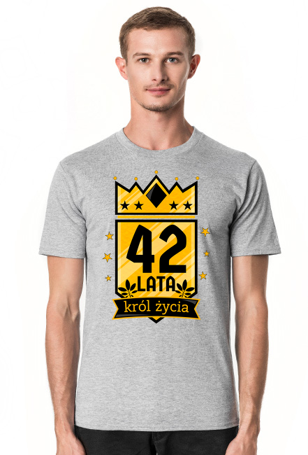 Męska koszulka na 42 urodziny z nadrukiem - Korona i napis "42 Lata Król Życia". Okazjonalny t-shirt na prezent. Koszulka z krótkim rękawem dla chłopaka, dla mężczyzny na 42-gie urodziny. Urodzinowy prezent dla syna, dla chłopaka, dla wnuka, dla kolegi, dla faceta, dla przyjaciela, dla osoby garściami korzystającej z życia i lubiącej humor na czterdzieste pierwsze urodziny. Czterdzieści dwa lata to wyjątkowy wiek dla mężczyzn bo mężczyźni wiedzą, że życie zaczyna się po czterdziestce. Czterdziestolatek to człowiek korzystający z pełni życia więc czterdziestka do fantastyczny wiek.