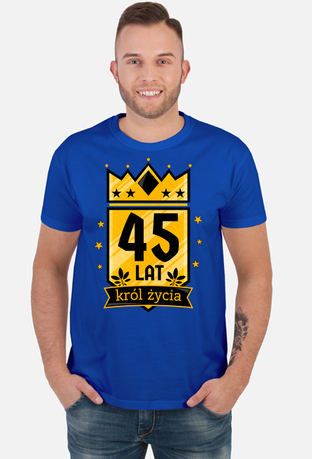 Męska koszulka na 45 urodziny z nadrukiem - Korona i napis "45 Lat Król Życia". Okazjonalny t-shirt na prezent. Koszulka z krótkim rękawem dla chłopaka, dla mężczyzny na 45-te urodziny. Urodzinowy prezent dla syna, dla chłopaka, dla wnuka, dla taty, dla ojca, dla wujka, dla dziadka, dla kuzyna, dla kolegi, dla faceta, dla przyjaciela, dla osoby garściami korzystającej z życia i lubiącej humor na czterdzieste piąte urodziny. Czterdzieści pięć lat to wyjątkowy wiek dla mężczyzn bo mężczyźni wiedzą, że życie zaczyna się po czterdziestce. Czterdziestolatek to człowiek korzystający z pełni życia więc czterdziestka do fantastyczny wiek.