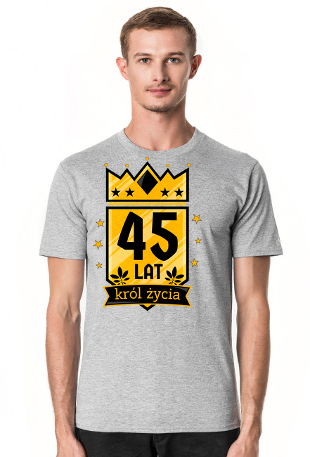 Męska koszulka na 45 urodziny z nadrukiem - Korona i napis "45 Lat Król Życia". Okazjonalny t-shirt na prezent. Koszulka z krótkim rękawem dla chłopaka, dla mężczyzny na 45-te urodziny. Urodzinowy prezent dla syna, dla chłopaka, dla wnuka, dla taty, dla ojca, dla wujka, dla dziadka, dla kuzyna, dla kolegi, dla faceta, dla przyjaciela, dla osoby garściami korzystającej z życia i lubiącej humor na czterdzieste piąte urodziny. Czterdzieści pięć lat to wyjątkowy wiek dla mężczyzn bo mężczyźni wiedzą, że życie zaczyna się po czterdziestce. Czterdziestolatek to człowiek korzystający z pełni życia więc czterdziestka do fantastyczny wiek.