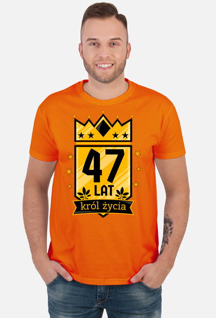 Męska koszulka na 47 urodziny z nadrukiem - Korona i napis "47 Lat Król Życia". Okazjonalny t-shirt na prezent. Koszulka z krótkim rękawem dla chłopaka, dla mężczyzny na 47-me urodziny. Urodzinowy prezent dla syna, dla chłopaka, dla wnuka, dla taty, dla ojca, dla wujka, dla dziadka, dla kuzyna, dla kolegi, dla faceta, dla przyjaciela, dla osoby garściami korzystającej z życia i lubiącej humor na czterdzieste siódme urodziny. Czterdzieści siedem lat to wyjątkowy wiek dla mężczyzn bo mężczyźni wiedzą, że życie zaczyna się po czterdziestce. Czterdziestolatek to człowiek korzystający z pełni życia więc czterdziestka do fantastyczny wiek.