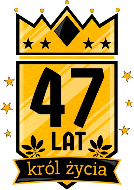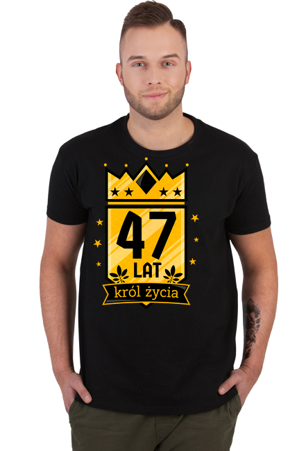 Męska koszulka na 47 urodziny z nadrukiem - Korona i napis "47 Lat Król Życia". Okazjonalny t-shirt na prezent. Koszulka z krótkim rękawem dla chłopaka, dla mężczyzny na 47-me urodziny. Urodzinowy prezent dla syna, dla chłopaka, dla wnuka, dla taty, dla ojca, dla wujka, dla dziadka, dla kuzyna, dla kolegi, dla faceta, dla przyjaciela, dla osoby garściami korzystającej z życia i lubiącej humor na czterdzieste siódme urodziny. Czterdzieści siedem lat to wyjątkowy wiek dla mężczyzn bo mężczyźni wiedzą, że życie zaczyna się po czterdziestce. Czterdziestolatek to człowiek korzystający z pełni życia więc czterdziestka do fantastyczny wiek.