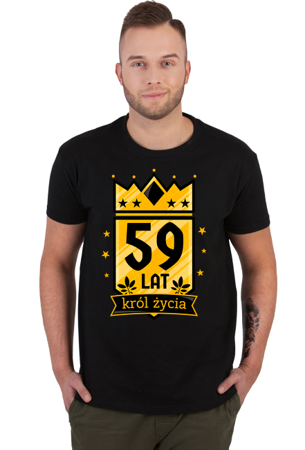 Męska koszulka na 59 urodziny z nadrukiem - Korona i napis "59 Lat Król Życia". Okazjonalny t-shirt na prezent. Koszulka z krótkim rękawem dla mężczyzny na 59-te urodziny. Urodzinowy prezent dla syna, dla chłopaka, dla wnuka, dla taty, dla ojca, dla wujka, dla dziadka, dla kuzyna, dla kolegi, dla faceta, dla przyjaciela, dla osoby garściami korzystającej z życia i lubiącej humor na pięćdziesiąte dziewiąte urodziny. Pięćdziesiąt dziewięć lat to wyjątkowy wiek dla mężczyzn bo mężczyźni wiedzą, że życie zaczyna się po pięćdziesiątce. Pięćdziesięciolatek to człowiek korzystający z pełni życia więc pięćdziesiątka to fantastyczny wiek.