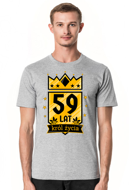 Męska koszulka na 59 urodziny z nadrukiem - Korona i napis "59 Lat Król Życia". Okazjonalny t-shirt na prezent. Koszulka z krótkim rękawem dla mężczyzny na 59-te urodziny. Urodzinowy prezent dla syna, dla chłopaka, dla wnuka, dla taty, dla ojca, dla wujka, dla dziadka, dla kuzyna, dla kolegi, dla faceta, dla przyjaciela, dla osoby garściami korzystającej z życia i lubiącej humor na pięćdziesiąte dziewiąte urodziny. Pięćdziesiąt dziewięć lat to wyjątkowy wiek dla mężczyzn bo mężczyźni wiedzą, że życie zaczyna się po pięćdziesiątce. Pięćdziesięciolatek to człowiek korzystający z pełni życia więc pięćdziesiątka to fantastyczny wiek.