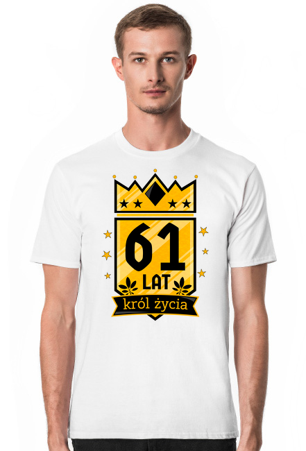 Męska koszulka na 61 urodziny z nadrukiem - Korona i napis "61 Lat Król Życia". Okazjonalny t-shirt na prezent. Koszulka z krótkim rękawem dla mężczyzny na 61-sze urodziny. Urodzinowy prezent dla syna, dla chłopaka, dla taty, dla ojca, dla wujka, dla dziadka, dla kuzyna, dla kolegi, dla faceta, dla przyjaciela, dla osoby garściami korzystającej z życia i lubiącej humor na sześćdziesiąte pierwsze urodziny. Sześćdziesiąt jeden lat to wyjątkowy wiek dla mężczyzn bo mężczyźni wiedzą, że życie zaczyna się po sześćdziesiątce. Sześćdziesięciolatek to człowiek korzystający z pełni życia więc sześćdziesiątka to fantastyczny wiek.