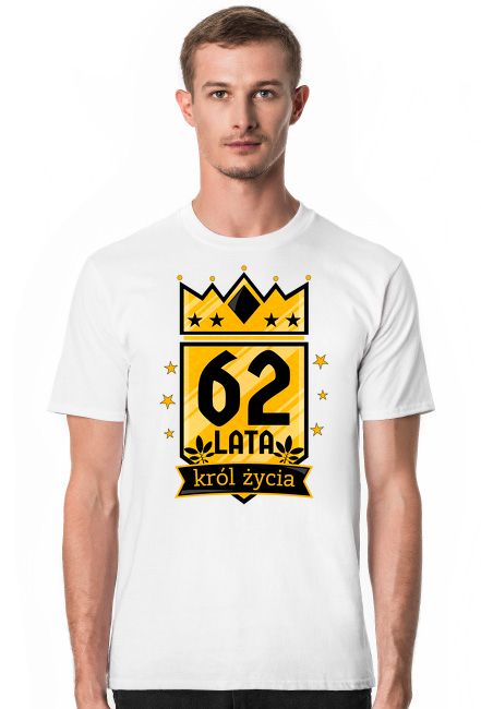 Męska koszulka na 62 urodziny z nadrukiem - Korona i napis "62 Lata Król Życia". Okazjonalny t-shirt na prezent. Koszulka z krótkim rękawem dla mężczyzny na 62-gie urodziny. Urodzinowy prezent dla syna, dla chłopaka, dla taty, dla ojca, dla wujka, dla dziadka, dla kuzyna, dla kolegi, dla faceta, dla przyjaciela, dla osoby garściami korzystającej z życia i lubiącej humor na sześćdziesiąte drugie urodziny. Sześćdziesiąt dwa lata to wyjątkowy wiek dla mężczyzn bo mężczyźni wiedzą, że życie zaczyna się po sześćdziesiątce. Sześćdziesięciolatek to człowiek korzystający z pełni życia więc sześćdziesiątka to fantastyczny wiek.