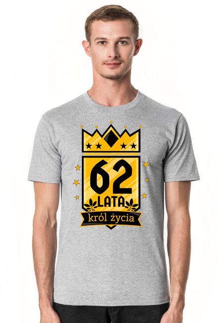 Męska koszulka na 62 urodziny z nadrukiem - Korona i napis "62 Lata Król Życia". Okazjonalny t-shirt na prezent. Koszulka z krótkim rękawem dla mężczyzny na 62-gie urodziny. Urodzinowy prezent dla syna, dla chłopaka, dla taty, dla ojca, dla wujka, dla dziadka, dla kuzyna, dla kolegi, dla faceta, dla przyjaciela, dla osoby garściami korzystającej z życia i lubiącej humor na sześćdziesiąte drugie urodziny. Sześćdziesiąt dwa lata to wyjątkowy wiek dla mężczyzn bo mężczyźni wiedzą, że życie zaczyna się po sześćdziesiątce. Sześćdziesięciolatek to człowiek korzystający z pełni życia więc sześćdziesiątka to fantastyczny wiek.