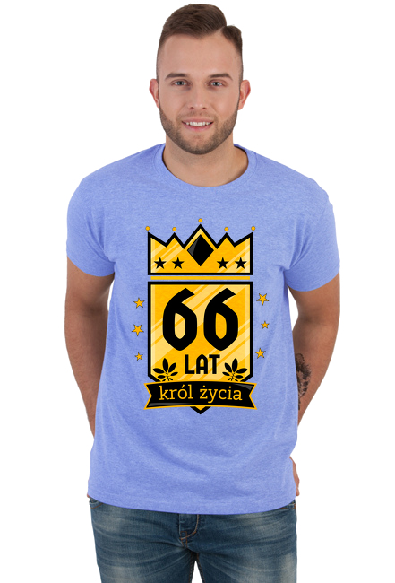 Męska koszulka na 66 urodziny z nadrukiem - Korona i napis "66 Lat Król Życia". Okazjonalny t-shirt na prezent. Koszulka z krótkim rękawem dla mężczyzny na 66-te urodziny. Urodzinowy prezent dla syna, dla chłopaka, dla taty, dla ojca, dla wujka, dla dziadka, dla kuzyna, dla kolegi, dla faceta, dla przyjaciela, dla osoby garściami korzystającej z życia i lubiącej humor na sześćdziesiąte szóste urodziny. Sześćdziesiąt sześć lat to wyjątkowy wiek dla mężczyzn bo mężczyźni wiedzą, że życie zaczyna się po sześćdziesiątce. Sześćdziesięciolatek to człowiek korzystający z pełni życia więc sześćdziesiątka to fantastyczny wiek.