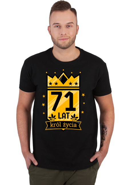 Męska koszulka na 71 urodziny z nadrukiem - Korona i napis "71 Lat Król Życia". Okazjonalny t-shirt na prezent. Koszulka z krótkim rękawem dla mężczyzny na 71-sze urodziny. Urodzinowy prezent dla chłopaka, dla taty, dla ojca, dla wujka, dla dziadka, dla kuzyna, dla kolegi, dla faceta, dla przyjaciela, dla osoby garściami korzystającej z życia i lubiącej humor na siedemdziesiąte pierwsze urodziny. Siedemdziesiąt jeden lat to wyjątkowy wiek dla mężczyzn bo mężczyźni wiedzą, że życie zaczyna się po siedemdziesiątce. Siedemdziesięciolatek to człowiek korzystający z pełni życia więc siedemdziesiątka to fantastyczny wiek.