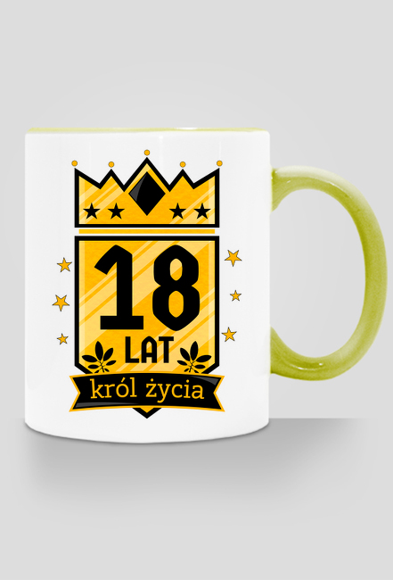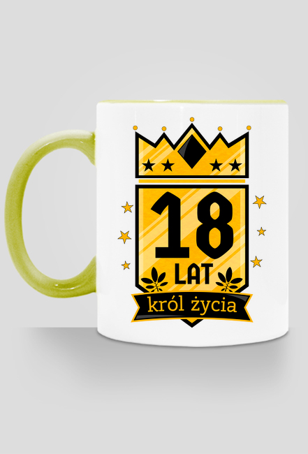 Kubek na 18 urodziny z nadrukiem. Korona i napis "18 Lat Król Życia". Nadruk dwustronny. Okazjonalny kubek na prezent na osiemnastkę. Kubeczek dla chłopaka, dla mężczyzny na 18-ste urodziny. Urodzinowy prezent dla syna, dla chłopaka, dla wnuka, dla kolegi, dla przyjaciela, dla osoby garściami korzystającej z życia. Osiemnastka to wyjątkowy wiek.