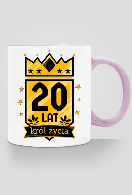 Kubek na 20 urodziny z nadrukiem. Korona i napis "20 Lat Król Życia". Nadruk dwustronny. Okazjonalny kubek na prezent na dwudziestkę. Kubeczek dla chłopaka, dla mężczyzny na 20-ste urodziny. Urodzinowy prezent dla syna, dla chłopaka, dla wnuka, dla kolegi, dla przyjaciela, dla osoby garściami korzystającej z życia. Dwadzieścia lat to wyjątkowy wiek.