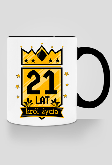 Kubek na 21 urodziny z nadrukiem. Korona i napis "21 Lat Król Życia". Nadruk dwustronny. Okazjonalny kubek na prezent na dwudzieste pierwsze urodziny. Kubeczek dla chłopaka, dla mężczyzny na 21-sze urodziny. Urodzinowy prezent dla syna, dla chłopaka, dla wnuka, dla kolegi, dla przyjaciela, dla osoby garściami korzystającej z życia. Dwadzieścia jeden lat to wyjątkowy wiek.
