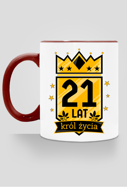 Kubek na 21 urodziny z nadrukiem. Korona i napis "21 Lat Król Życia". Nadruk dwustronny. Okazjonalny kubek na prezent na dwudzieste pierwsze urodziny. Kubeczek dla chłopaka, dla mężczyzny na 21-sze urodziny. Urodzinowy prezent dla syna, dla chłopaka, dla wnuka, dla kolegi, dla przyjaciela, dla osoby garściami korzystającej z życia. Dwadzieścia jeden lat to wyjątkowy wiek.