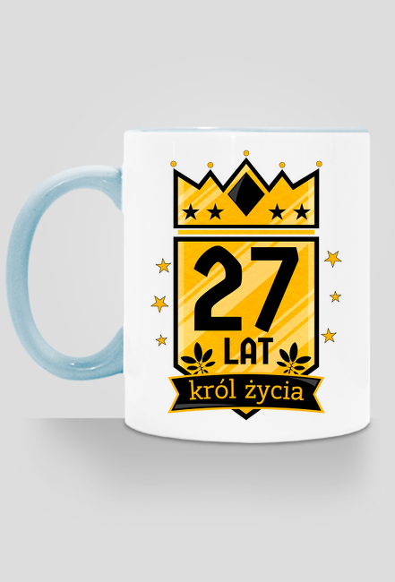 Kubek na 27 urodziny z nadrukiem - Korona i napis "27 Lat Król Życia". Nadruk dwustronny. Okazjonalny kubek na prezent na dwudzieste siódme urodziny. Kubeczek dla chłopaka, dla mężczyzny na 27-me urodziny. Urodzinowy prezent dla syna, dla chłopaka, dla wnuka, dla kolegi, dla przyjaciela, dla osoby garściami korzystającej z życia i lubiącej humor. Dwadzieścia siedem lat to wyjątkowy wiek dla mężczyzn.