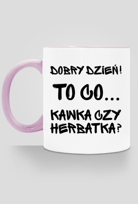 Biało-kolorowy kubek na co dzień z życiowym pytaniem o poranku - Dobry Dzień! To Co... Kawka Czy Herbatka?