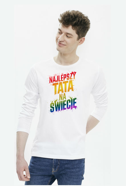 Męska koszulka z długim rękawem z nadrukiem - Najlepszy Tata Na Świecie. Koszulka dla taty z humorem. Idealny prezent na Dzień Ojca, na Dzień Taty, na urodziny lub na imieniny taty. Zabawny t-shirt z długim rękawem. Koszulka z napisem dla taty. Fantazyjny, kolorowy napis, bo dobrze wiesz, że Twój Tata jest Najlepszy Na Świecie.
