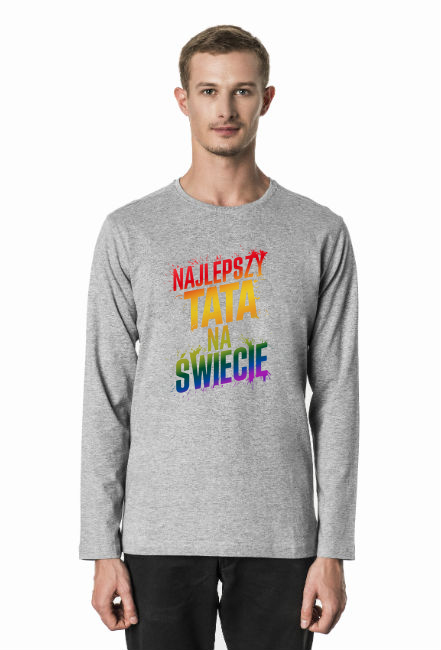 Męska koszulka z długim rękawem z nadrukiem - Najlepszy Tata Na Świecie. Koszulka dla taty z humorem. Idealny prezent na Dzień Ojca, na Dzień Taty, na urodziny lub na imieniny taty. Zabawny t-shirt z długim rękawem. Koszulka z napisem dla taty. Fantazyjny, kolorowy napis, bo dobrze wiesz, że Twój Tata jest Najlepszy Na Świecie.
