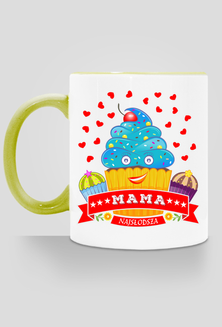 Biały kubek z kolorowym akcentem i dwustronnym nadrukiem - napis Najsłodsza Mama i babeczka. Kubek dla mamy z humorem. Idealny prezent na Dzień Matki, na urodziny lub na imieniny mamy. Zabawny kubeczek z napisem i grafiką - kolorową babeczką.