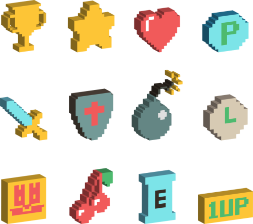 Zestaw ikon inspirowanych starą grafiką i stylem retro Pixel Art. Idealne na każdą okazje lub aby sprawić sobie nostalgiczny prezent.