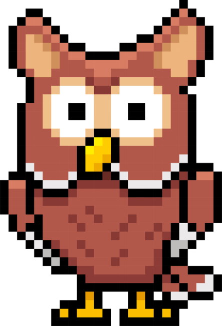Grafika przedstawia Sowę. Styl inspirowany grą Minecraft i wieloma innymi nawiązującymi do dawnych lat. Grafika w stylu retro Pixel Art. Idealny prezent na każdą okazje lub aby sprawić sobie nostalgiczny, śmieszny, oryginalny upominek ;)