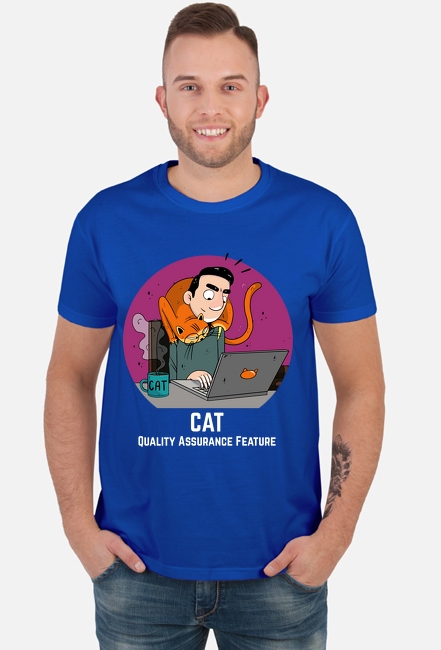 Niebieski t-shirt/koszulka "CAT Quality Assurance Feature"; kolor grafiki różowy; model 2W; nadruk duży. Fajny gadżet dla tłumacza. Fajny prezent dla tłumacza