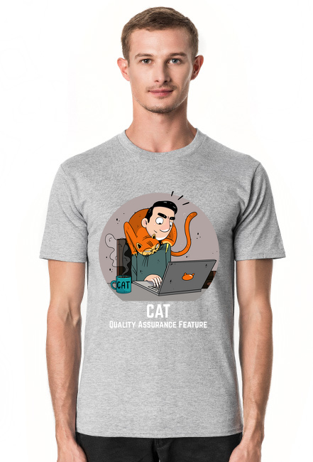 Szary t-shirt/koszulka "CAT Quality Assurance Feature"; kolor grafiki szary; model 2W; nadruk duży. Fajny gadżet dla tłumacza. Fajny prezent dla tłumacza