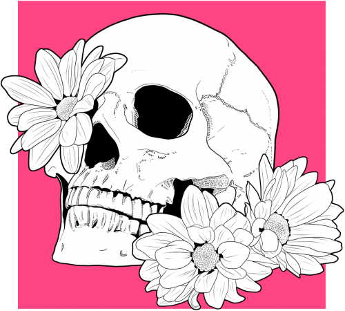 Oryginalna ilustracja stworzona przez artystkę o ksywce Brysia. Czarnobiała ilustracja z różowym tłem przedstawia czaszkę, wokół której leżą trzy kwiaty. Jeden z nich jest wsadzony w oczodół czaszki.