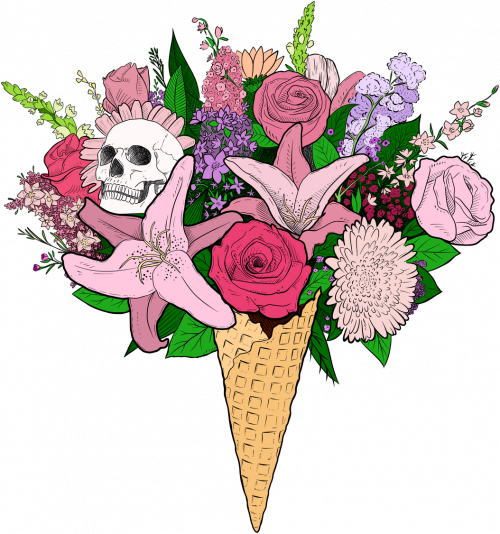 Oryginalna ilustracja stworzona przez artystkę o ksywce Brysia. Kolorowa ilustracja przedstawia bukiet kwiatów umieszczony w rożku na lody. Wśród kwiatów znajduje się czaszka.